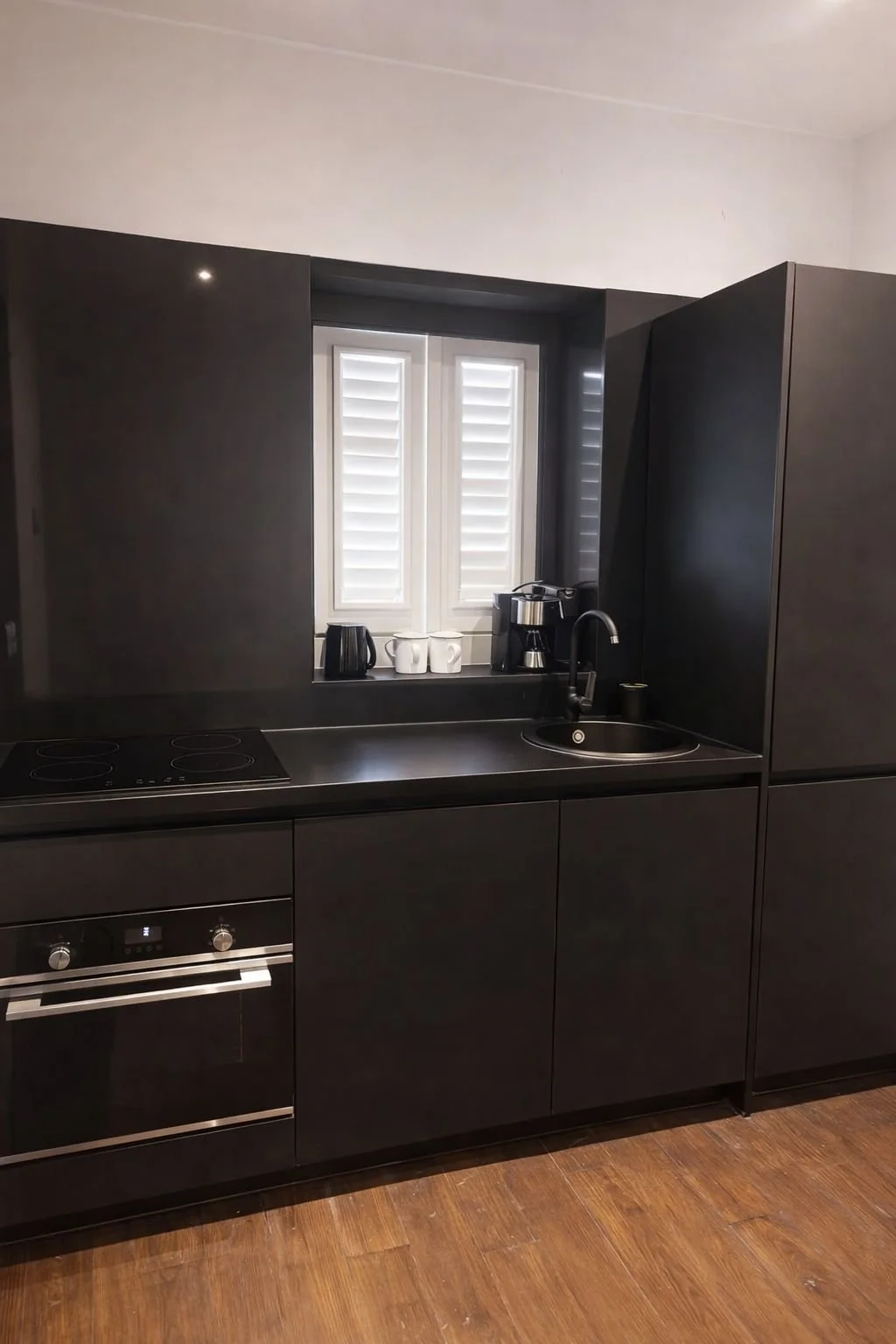 Our well-equipped and spacious kitchen awaits your culinary adventures. The kitchen features a microwave oven, a ceramic cooktop with four elements and a refrigerator, providing everything you need to prepare meals during your stay. A Nespresso coffee machine as well as a regular coffee machine are available, and coffee and tea supplies are provided for the first days of your stay.